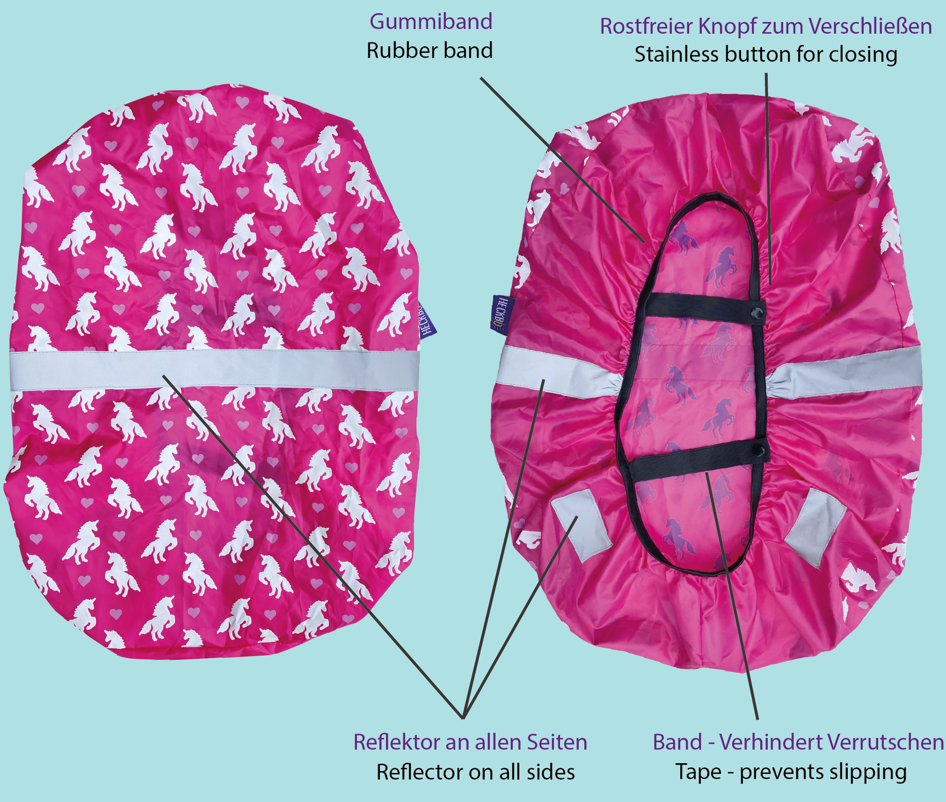 SATEEN- JA TUULENSUOJA: HECKBO-sadetakki on valmistettu kestävästä polyesterikankaasta, joka pitää koulukassin ja sen sisällä olevat koulutarvikkeet, kuten kirjat ja vihkot, kuivina. Käytön jälkeen märän sadesuojan voi säilyttää mukana tulevassa pussissa. Sen koko on vain noin 21 x 12 cm, ja se voidaan kiinnittää myös repun ulkopuolelle kestävän koukun ja noin 70 g painon ansiosta.