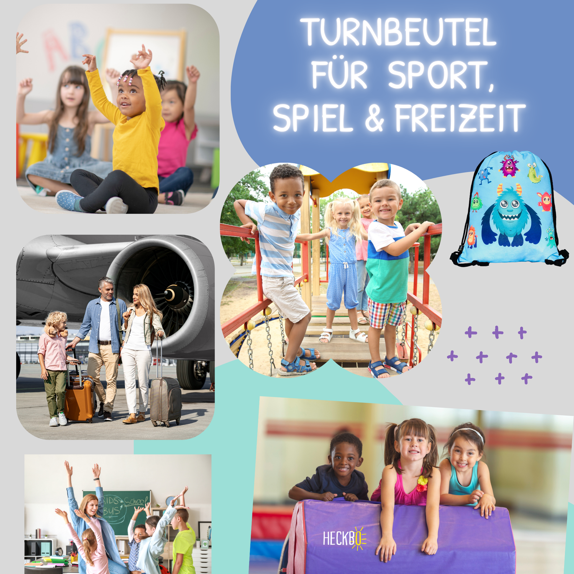 Puuvilla- ja polyesterisekoitus – kestävä, vakaa ja sopii päivittäiseen käyttöön. Vahvistetut kulmat varmistavat turvallisen kuljetuksen – myös painavamman sisällön kanssa. Yksilöllisesti säädettävät narujen – optimaalisesti sopeutuu pienemmille ja suuremmille lapsille. Vetonauhakiinnitys – helppo avata ja sulkea, jopa pienille käsille.