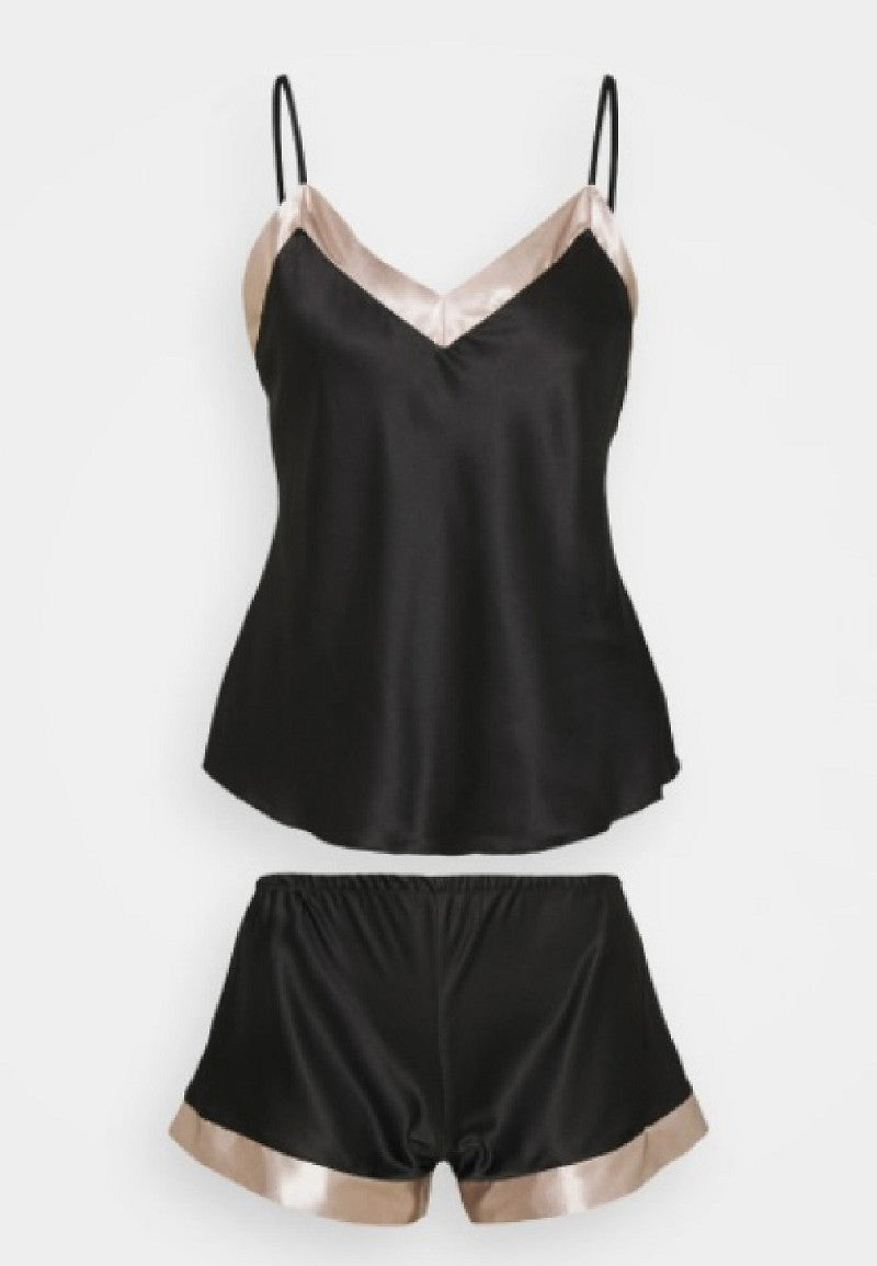 Ylellinen satiininen yöasusetti. Settiin kuuluu narutoppi ja shortsit. Kaunis Mustan ja Shampanjan yhdistelmä. laatuan ja kauneutta arvostavalle.
